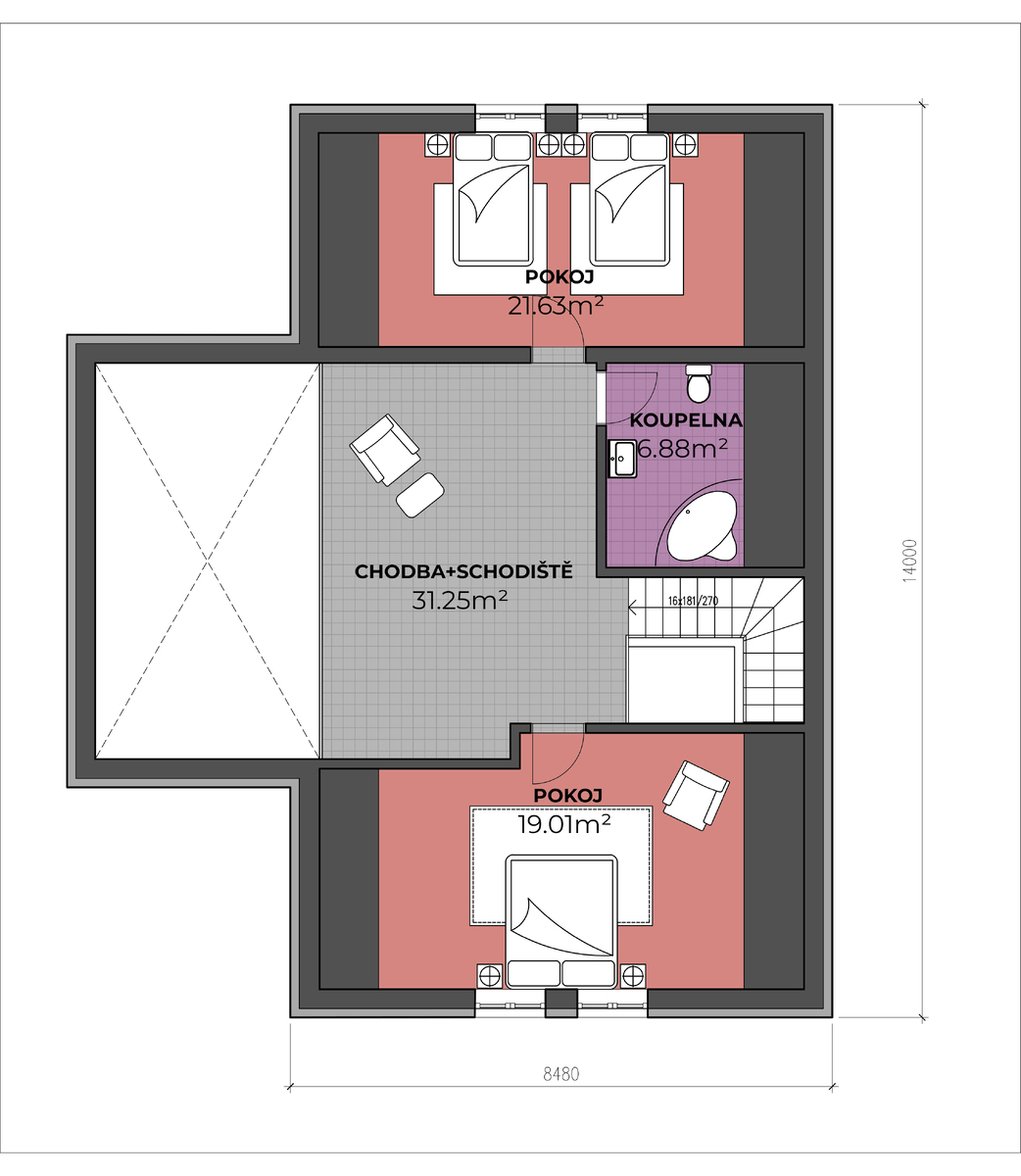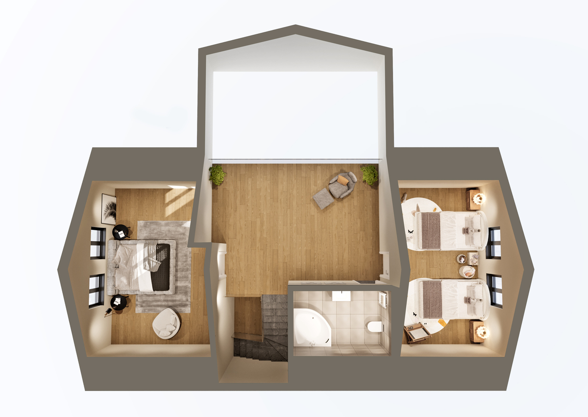 V patře se nachází dva pokoje (19,01 m² a 21,63 m²), druhá koupelna (6,88 m²) a otevřená galerie s chodbou (31,25 m²), kterou lze využít jako relaxační zónu nebo dětský koutek. Díky velkým oknům je horní patro krásně prosvětlené a působí vzdušně.